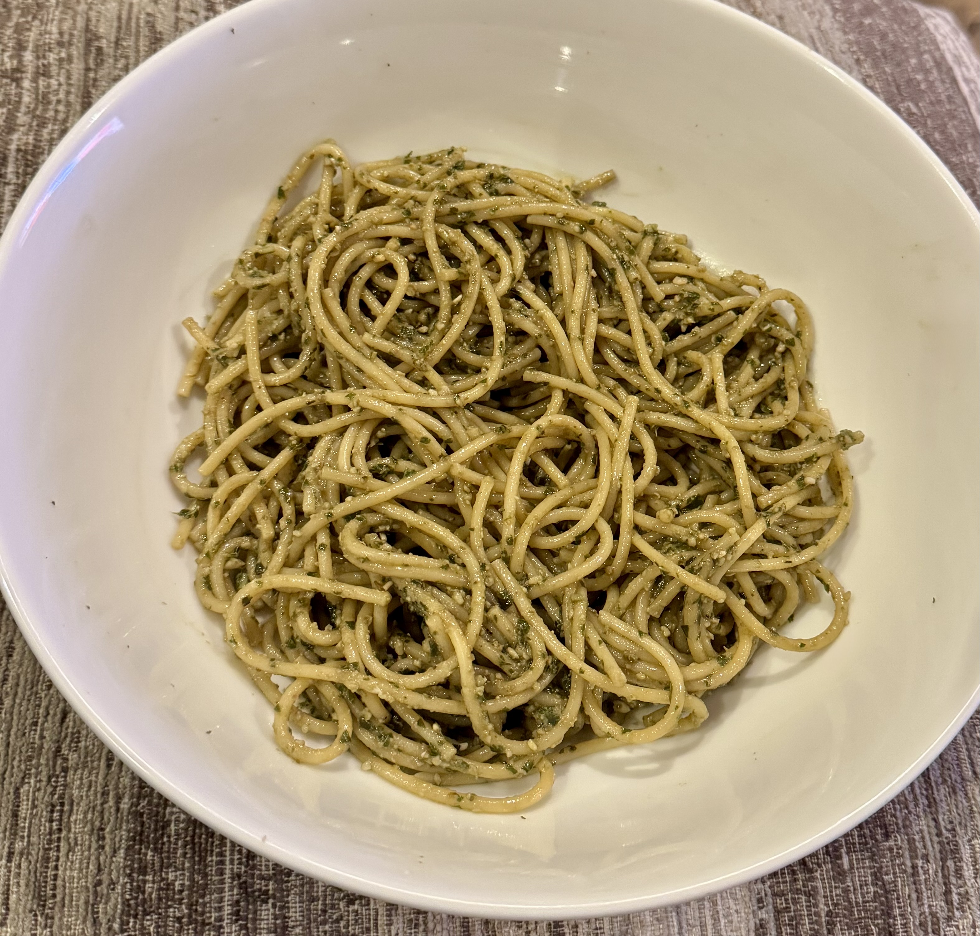 Since pasta with pesto does not happen very frequently at our house I was rewarded with “yum” from Sarah and a suggestion that I make it again soon from John.