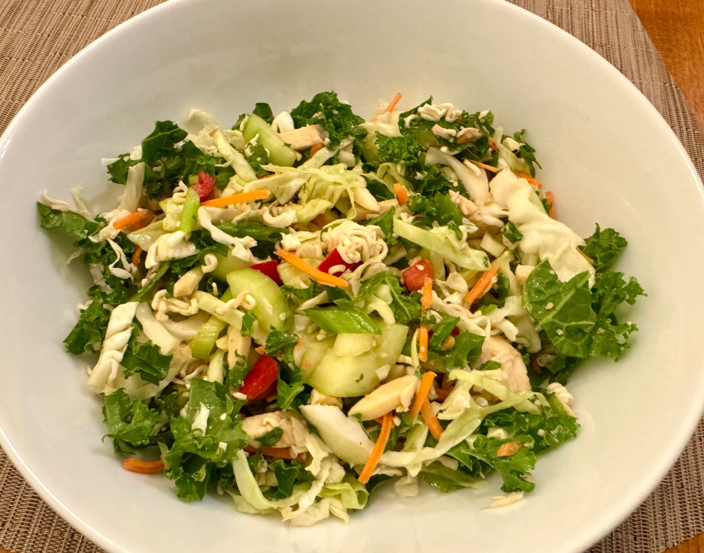 The ramen noodles are used straight from the package and they soften somewhat in the vinaigrette. She used cabbage and kale for her greens, leftover rotisserie chicken chunks, shredded carrot, cucumber, and cherry tomatoes. It is a fun crunchy salad to eat and we got to talk about “the old days” when she and her brother were kids.
