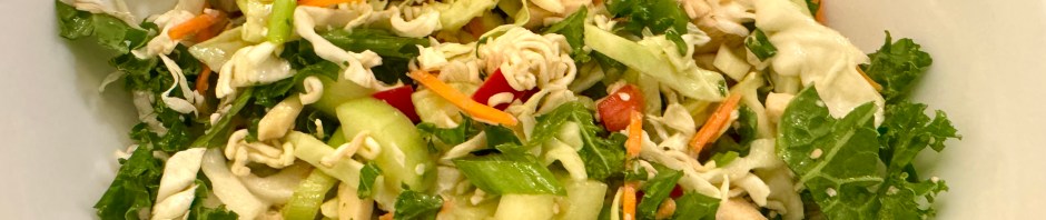 The ramen noodles are used straight from the package and they soften somewhat in the vinaigrette. She used cabbage and kale for her greens, leftover rotisserie chicken chunks, shredded carrot, cucumber, and cherry tomatoes. It is a fun crunchy salad to eat and we got to talk about “the old days” when she and her brother were kids.