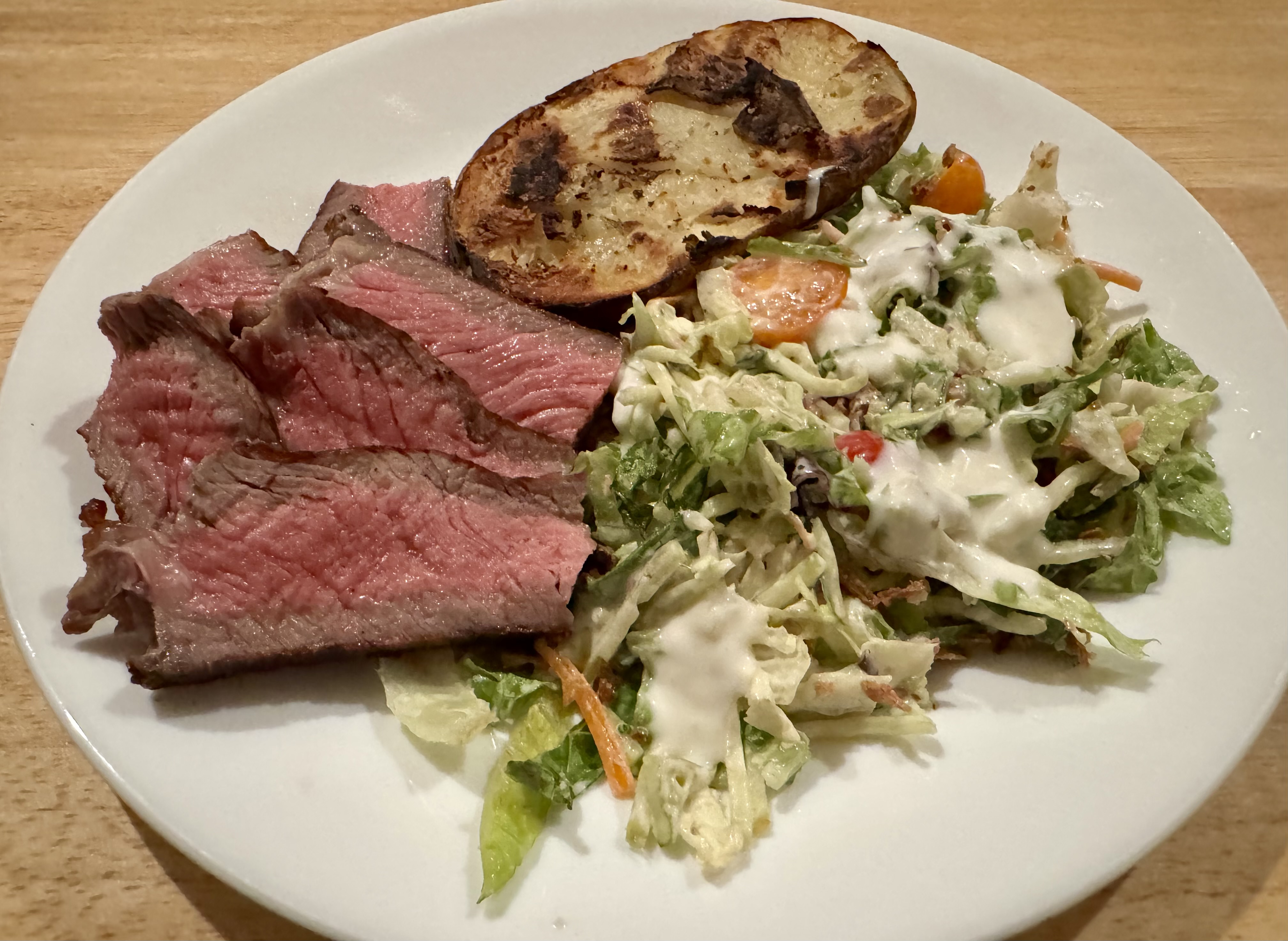 John grilled the steak, I made the potato, and Sarah assembled the salad. Fast, easy, delicious dinner for a hot night.