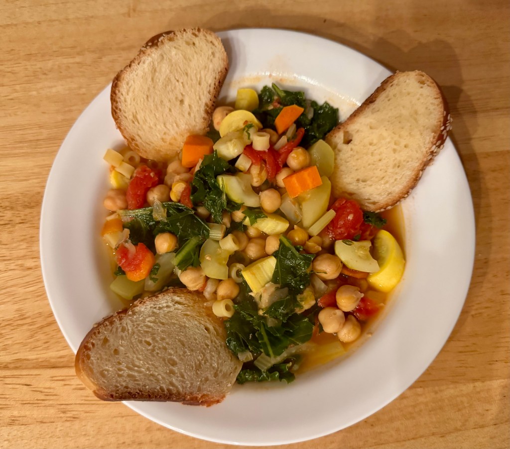 Making chickpea stew is an easy way to use up leftover vegetables that may be getting limp in the refrigerator. In addition to the chickpeas, Ditalini, and broth I added tomatoes, thyme, and zucchini from the garden and carrots, fennel, kale, and celery from the fridge.