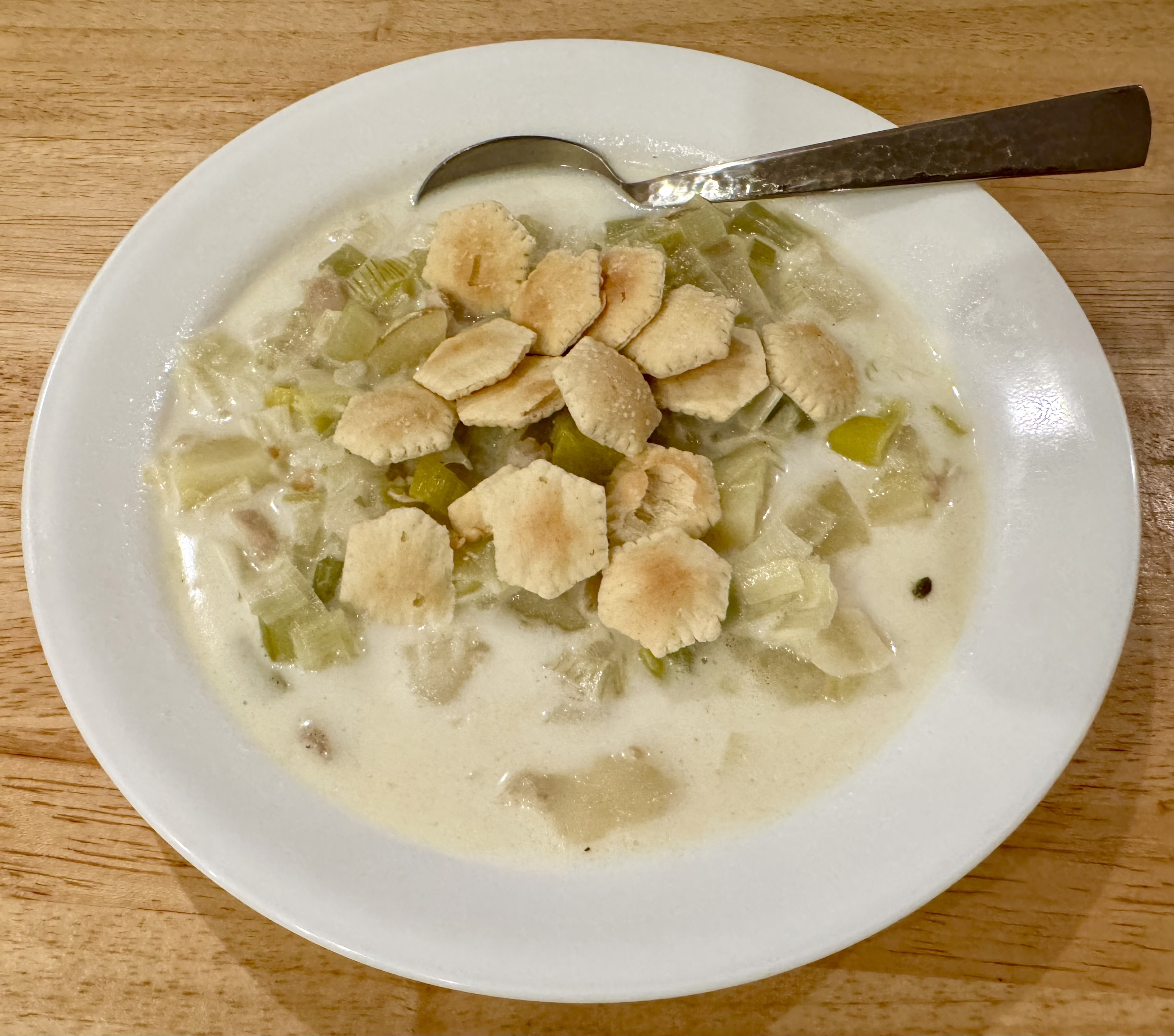 The clam chowder that I make is a cross between the traditional New England clam chowder and Rhode Island clam chowder. It is not so thick that your spoon can stand up in it but it is not just the ingredients in an almost clear clam or fish broth. It all depends on how much cream you are willing to use. The amount I use varies between 2 tablespoons and 1/2 cup of heavy cream. If all I have on hand is half and half I would use a little more. No matter what or how much dairy you use is up to you. It will still taste good.