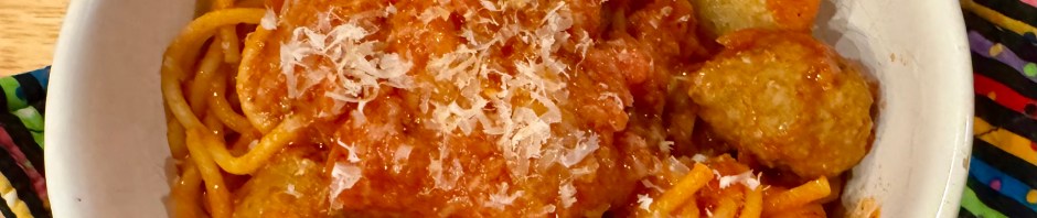 Tonight was Sarah’s night to cook and she took the shortcut route. With the help of Barilla spaghetti, Rosina’s frozen meatballs, and Rao’s vodka sauce dinner was ready in a flash. I make diners with shortcuts occasionally so I am in no position to throw stones. The bowls she served us were garnished with olive oil, Parmesan cheese, and a slice of garlic bread. Yum!