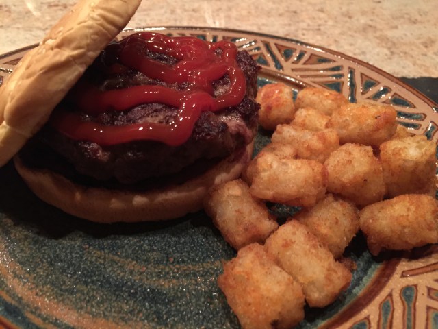 For our first cooking night in Utah John made probably the most delicious burgers ever. Rosy pink on the inside and nicely charred on the inside. We had tater tots and a small green salad along side.