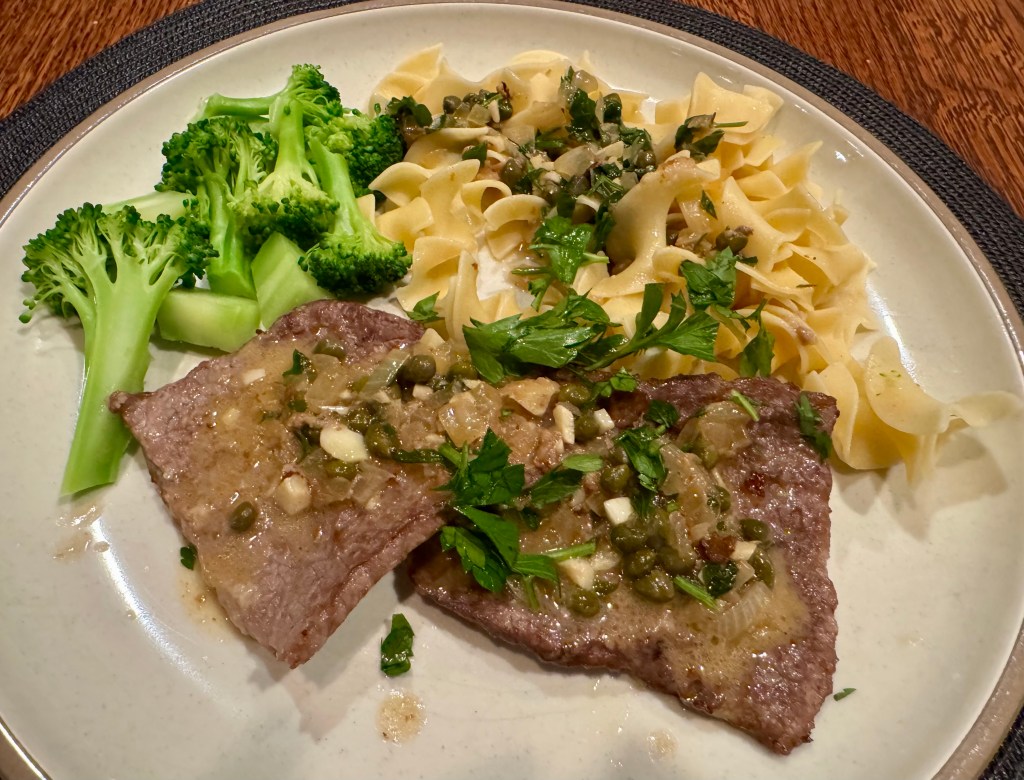 We tried something new for dinner. We had found some very thinly sliced beef. The pieces were top round but looked well-marbled. Jon did a quick pan-fry and we served the meat piccata style with noodles and broccoli. Unfortunately the meat was very chewy and basically tasteless. We have lots of leftover noodles that we will try serving with chicken piccata on Friday. Hopefully that will work better.