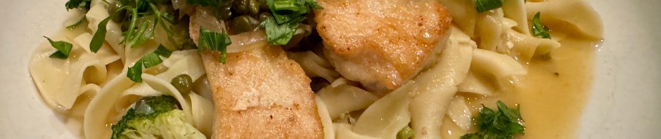 Well, this worked out much better than our previous try! We found some sliced chicken breast that John floured and pan-fried. We kept the chicken pieces warm in the oven while I rustled up the rest of the dinner. First I rehydrated the noodles in some chicken stock and added broccoli florets. In the pan that the chicken had cooked in I added some butter and chopped onions, capers, and garlic. Then I added white wine, a half lemon’s worth of juice, and some of the noodles chicken stock. I was hoping that the chicken stock had picked up some of the starch from the noodles. I reduced the sauce briefly and then plated the noodles and broccoli combo, followed by the chicken, and then the sauce. Some parsley garnish finished the dish.