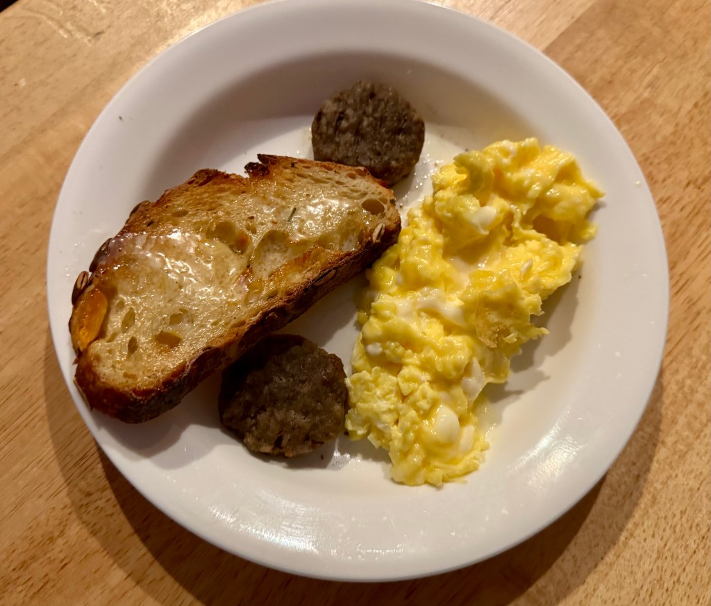 This is two eggs scrambled with a bit of cheese, two tiny sausage patties, and a piece of country style bread with butternut squash and butter.