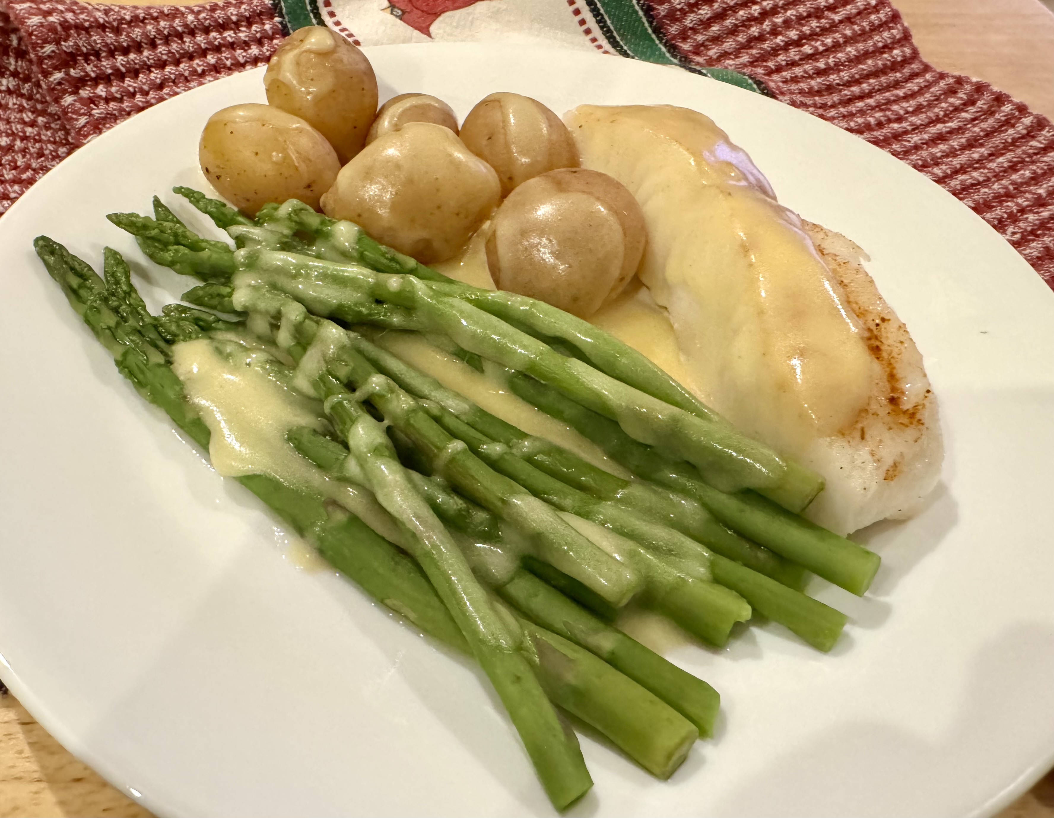 Happy birthday to me! John roasted the fish in a 400F oven for 13 minutes and made the hollandaise sauce (from a Knorr packet) while I steamed the potatoes and sauteed asparagus. I think we should have made a beurre blanc instead of using the Knorr packet or at least squeezed some lemon into the sauce because it was missing an acidic zing. But mostly my birthday dinner was lovely.