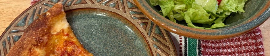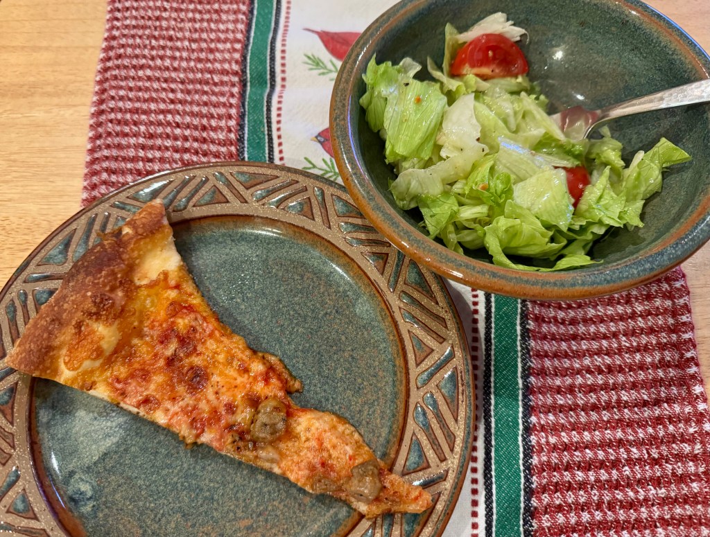 George is homebound these days so we ordered pizza and I brought a salad to our luncheon party. We had so much left over that John and I decided to ax the planned chicken wings and just go with sharing a piece of pizza and finishing up the salad for dinner. Happy birthday, George!