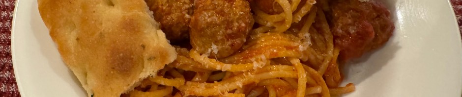 This is a quick version of spaghetti and meatballs. The Rosina brand of meatballs and a little red wine increased the flavor of Rao’s vodka sauce. All we had to do was cook the spaghetti combine it with the sauce and we were done. We also had acquired a piece of focaccia from a bargain table at a local grocer’s to serve alongside. It was a yummy dinner!