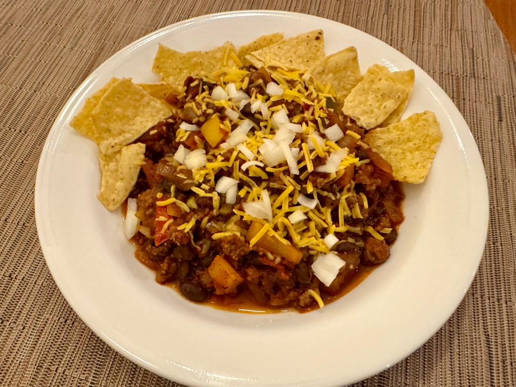 Tonight is Sarah’s night to cook. She had found a large can of Muir Glen chili starter for $.99 and some ground beef on sale so she was eager to make chili. She added some garlic and onion plus some chipotle chili powder which gave the chili a pleasant smoky/spicy taste. She sautéed the garlic and onion and browned the meat before adding the chili starter. After a short time of simmering the chili was ready. She really made a great tasting chili!