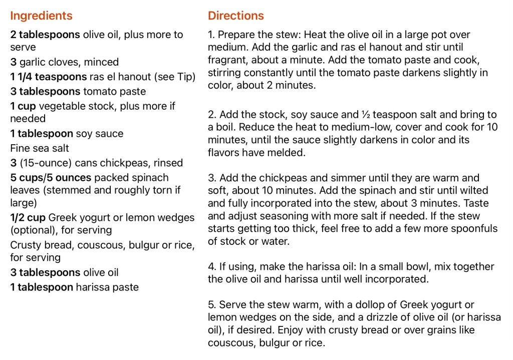 This is a new recipe for a vegan dinner that I saw on the New York Times Cooking site. Much like everyone else I am trying to eat in a healthier manner. I am including the recipe below but I did not make it absolutely the same. First of all, I am just cooking for John and me so I cut the amount of chickpeas down to two cans. We like lots of sauce so I upped the stock to two cups and I opted for kale instead of spinach. Everything else I left the same.