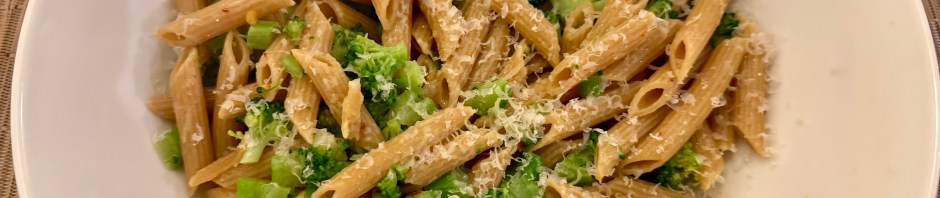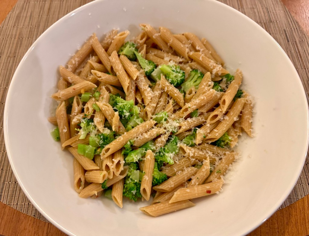 According to my Weekly Menu we are supposed to be having a chicken dinner. I changed the plan because I was craving pasta. John cooked up a bunch of penne and I cut up the broccoli into very small pieces and put the pieces in a colander. My idea was to strain the pasta and at the same time blanch the broccoli. Ta da! It worked perfectly. I added a half cup of reserved pasta water and a couple of tablespoons of olive oil into the penne and broccoli mixture. Each bowl also had a sprinkle of parmesan cheese.