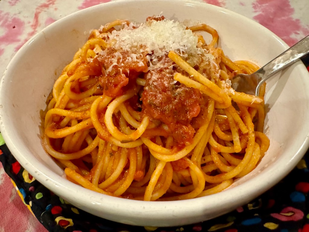 This dinner was a sub for the fresh ravioli that spent too long in the fridge and got moldy. It was too bad but any (non-moldy) pasta dinner is A-OK with me. Boxed spaghetti, frozen meatballs, and jarred sauce made a perfectly acceptable dinner for us.