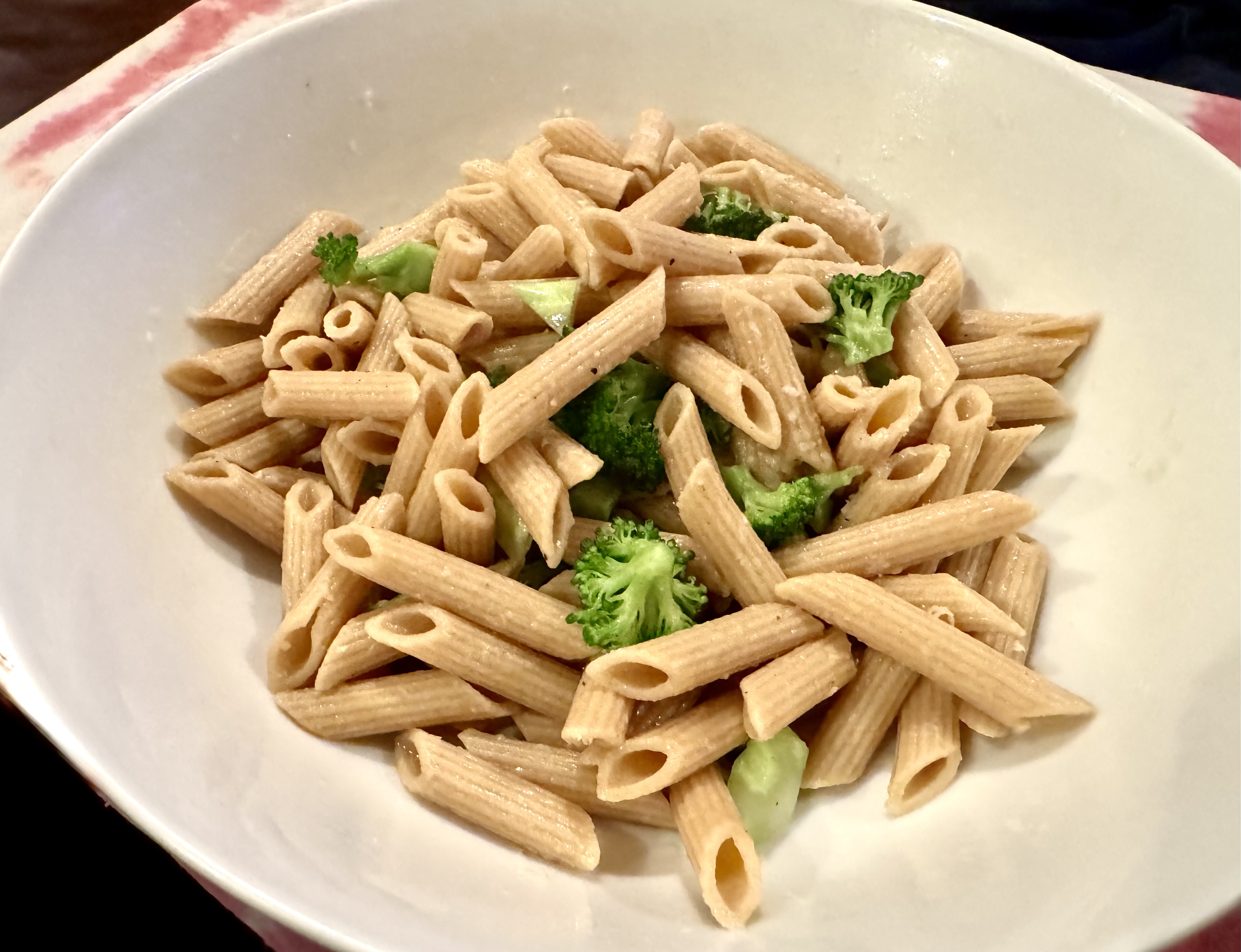 I made this pasta recently and we both liked it so much I made it again. My secret? Bring a pot of salted water to a boil and add the pasta. Put small broccoli florets in a colander and when the penne is al dente, reserve a half cup of the pasta water, and then pour the water and the penne over the florets in the colander. Put everything back in the pot and add olive oil and some reserved pasta to make a little sauce. All you need now is grated parmesan and you are done.