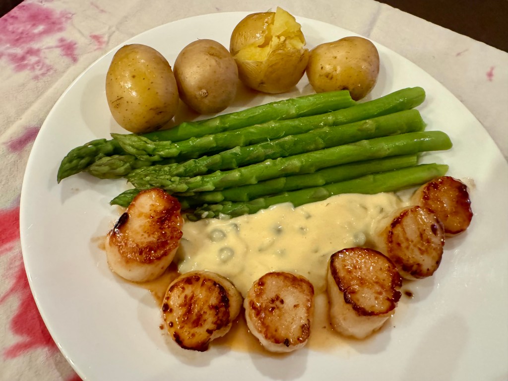 We used to get large frozen scallops in a clear plastic bag from Costco. They have disappeared for at least a year. We decided to try the Kirkland frozen scallops. They are smaller but they turned out really tasty. John does a great job searing them in a little olive oil and butter. I steamed the new potatoes and sauteed the asparagus.