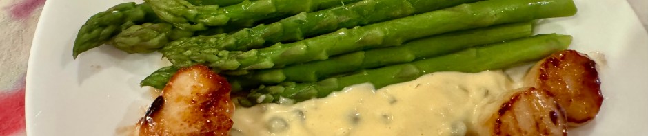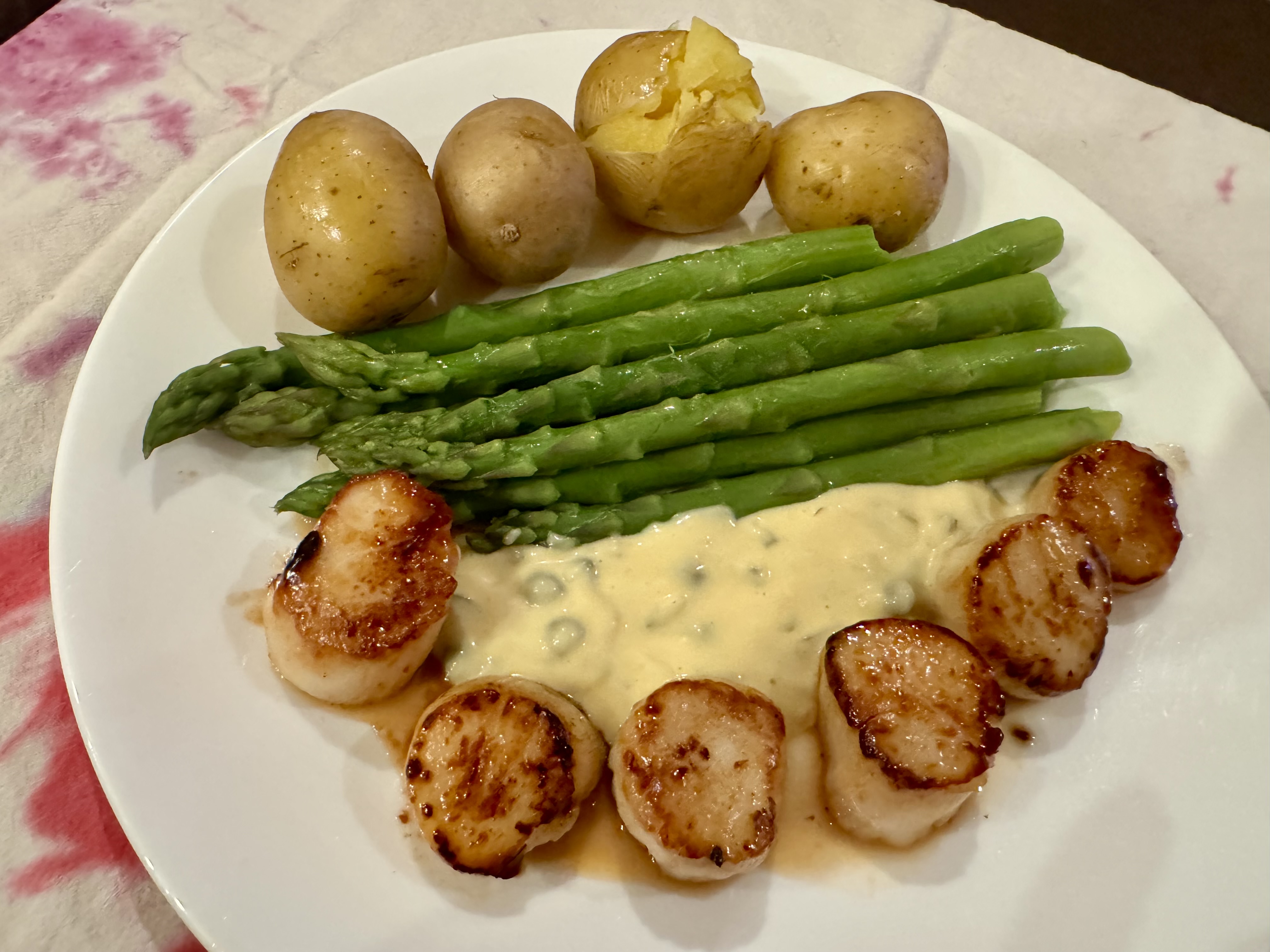 We used to get large frozen scallops in a clear plastic bag from Costco. They have disappeared for at least a year. We decided to try the Kirkland frozen scallops. They are smaller but they turned out really tasty. John does a great job searing them in a little olive oil and butter. I steamed the new potatoes and sauteed the asparagus.