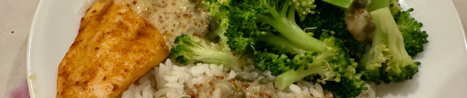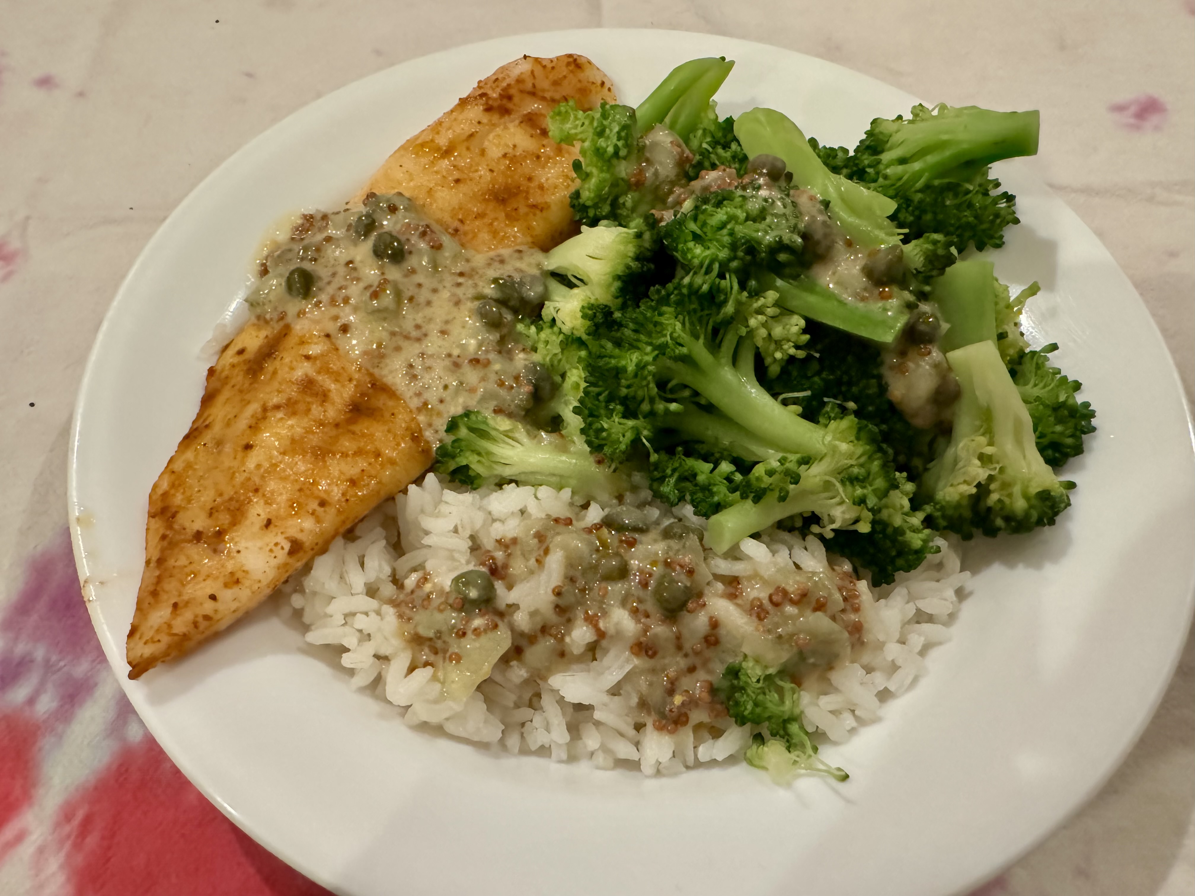Mustard sauce is easy to make and not too rich. It gives our fish dishes a nice tang. John is always happy when I make it. You can see from my picture that it also tastes good on rice and vegetables!
