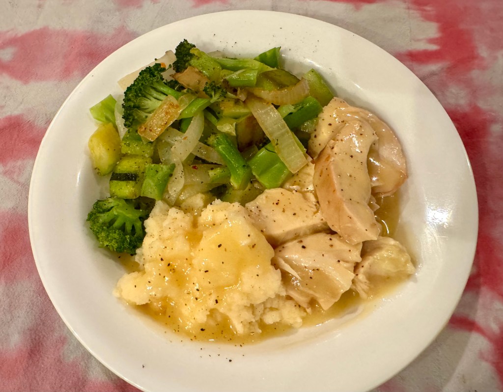 Easy peasy dinner using the convenience of Costco rotisserie chicken, a packet of chicken gravy, Idahoan powdered potatoes, and a fresh mixed vegetable. Originally our veg was supposed to be just broccoli but I discovered that we did not have enough so I added a zucchini and some onions. Actually made our vegetable a bit more exciting!
