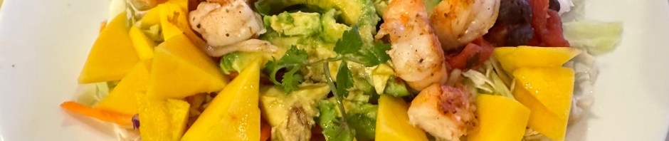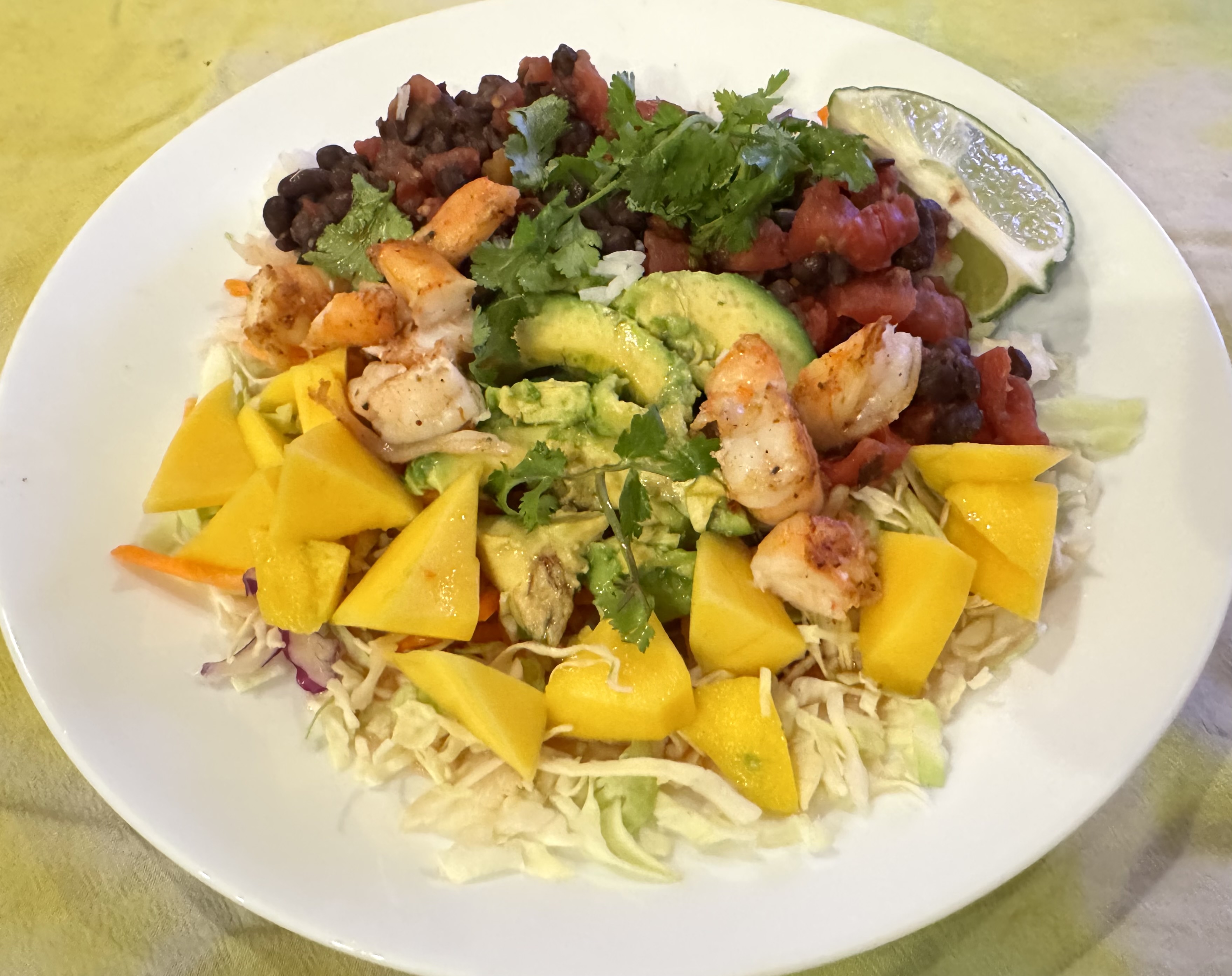 Tonight’s taco has shrimp, spicy black beans, cabbage, mango, salsa, cilantro, and a squeeze of lime. I am slowed down by using a knife and fork. I feel much more satisfied with my non-traditional taco.