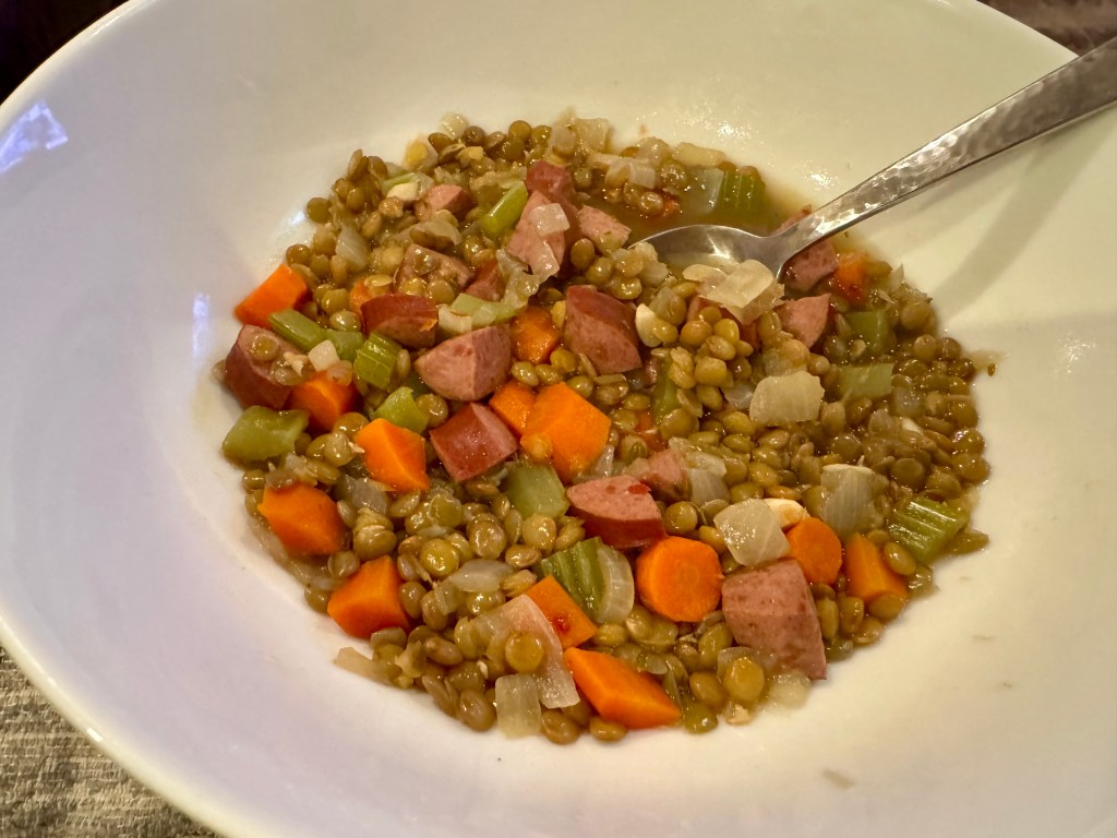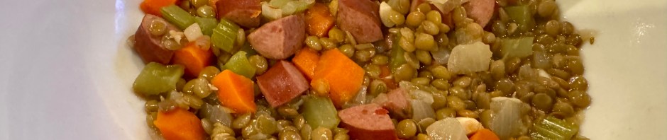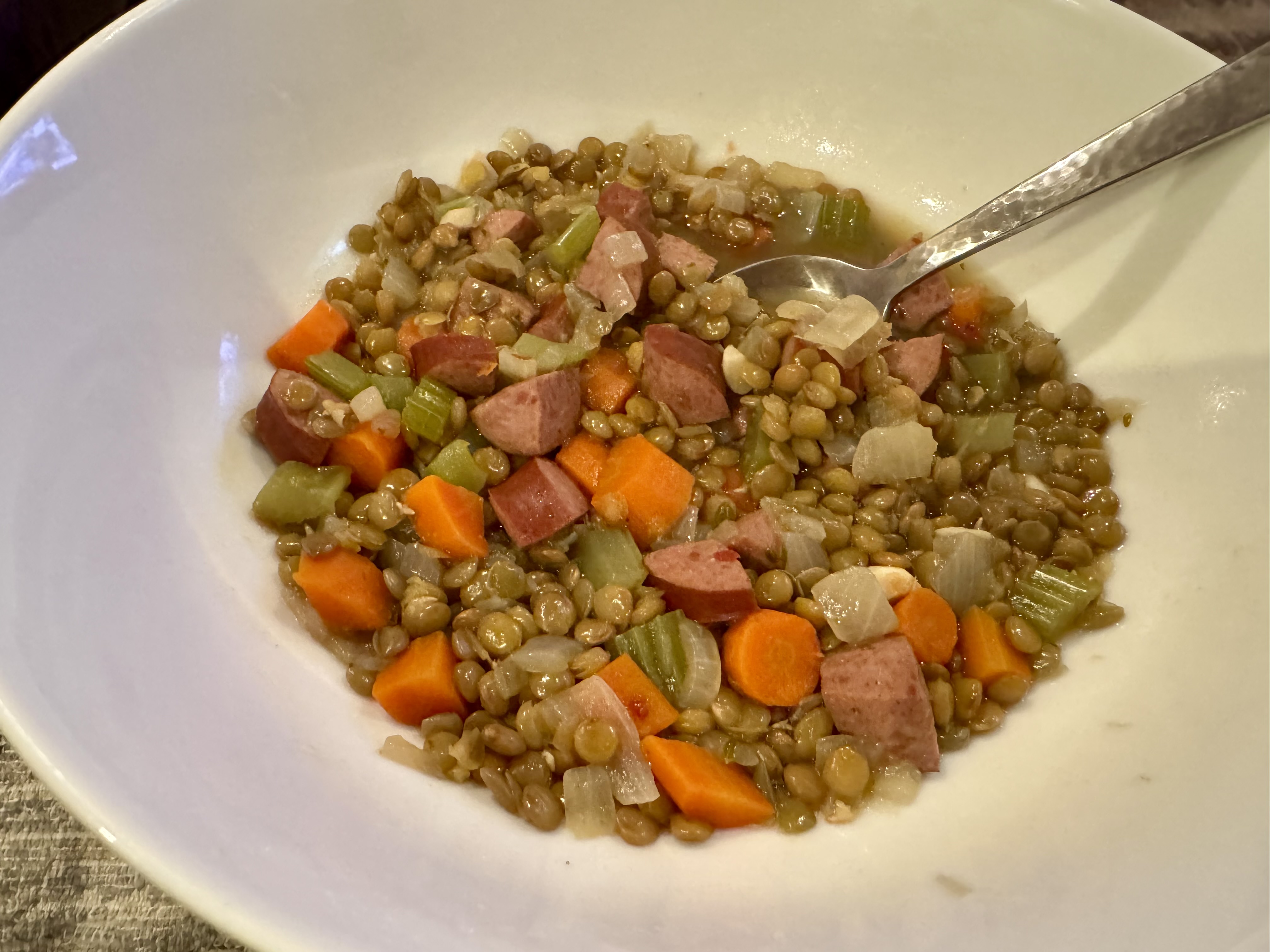 We are having one of our comfort dishes tonight, lentils with turkey sausage and vegetables. I have a phone call with my dear friend, Sophie, on Mondays late in the afternoon so I like to plan a dinner that John can do most of the prep while I am on the phone. He does a great job cutting up all the veg, the sausage, and weighing out the lentils. It makes cooking dinner super simple.