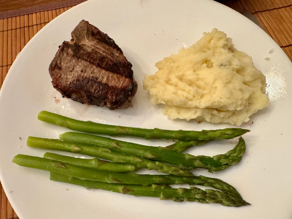 John grilled these lamb chops to a rosy hue for our Passover Seder. Along with the lamb chops were matzoh ball soup, mashed potatoes, asparagus, and macaroons made by Sarah.