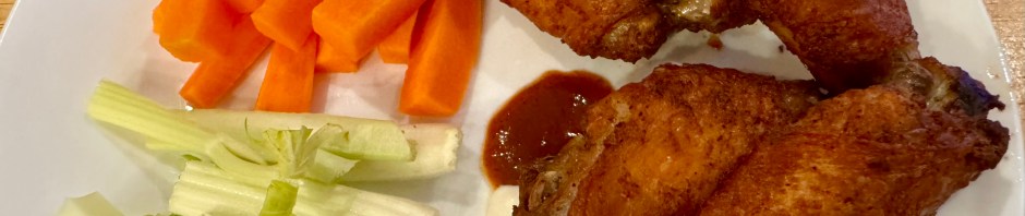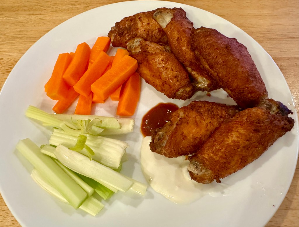 On Friday we tried the Costco brand of chicken wings. They cook for 25 minutes at 425F. They came out perfectly done and crispy. While John used the Buffalo dressing included in the wings package, I had mine with a little sriracha and blue cheese dressing.