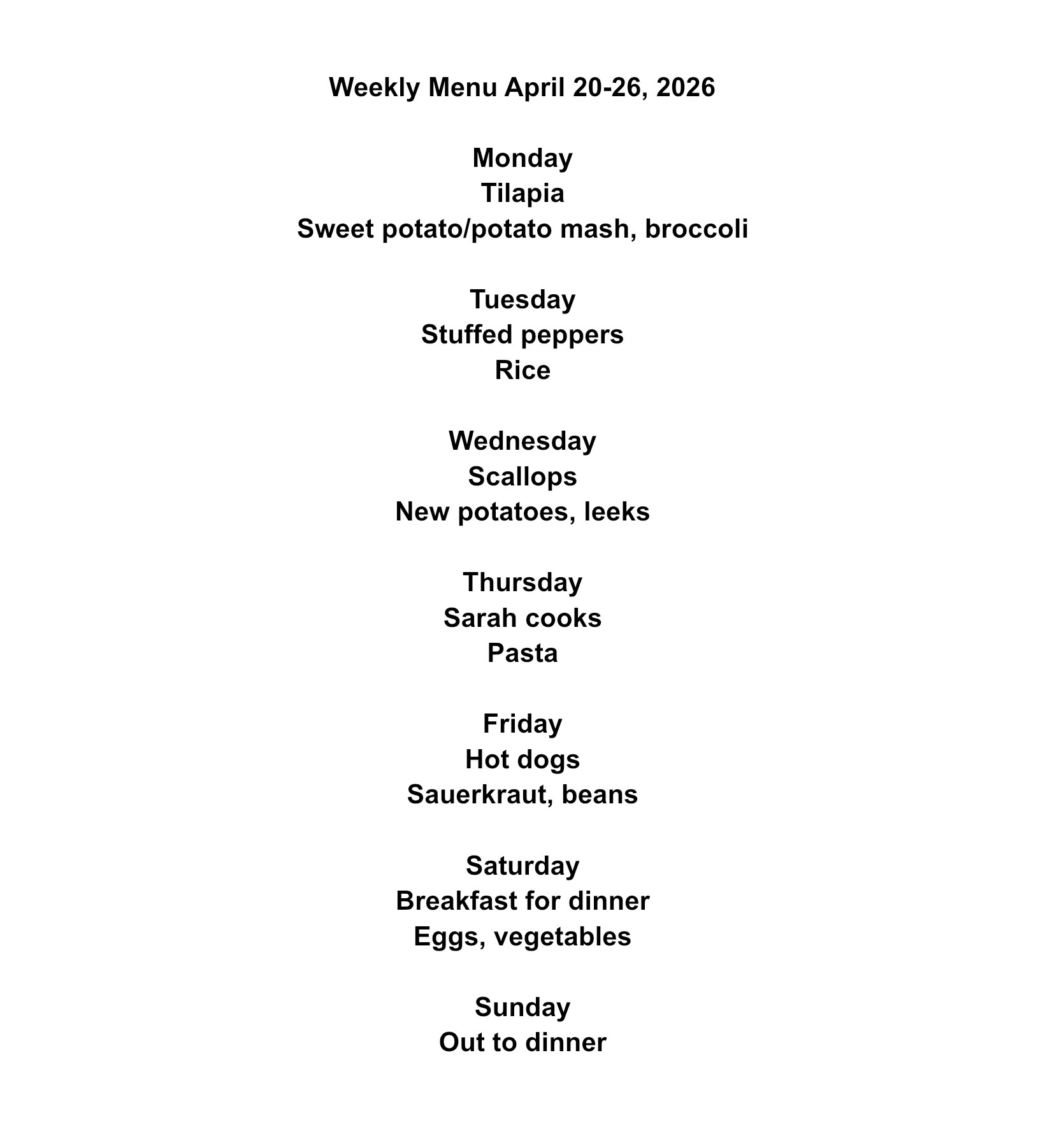 Weekly Menu. April 20-26, 2026