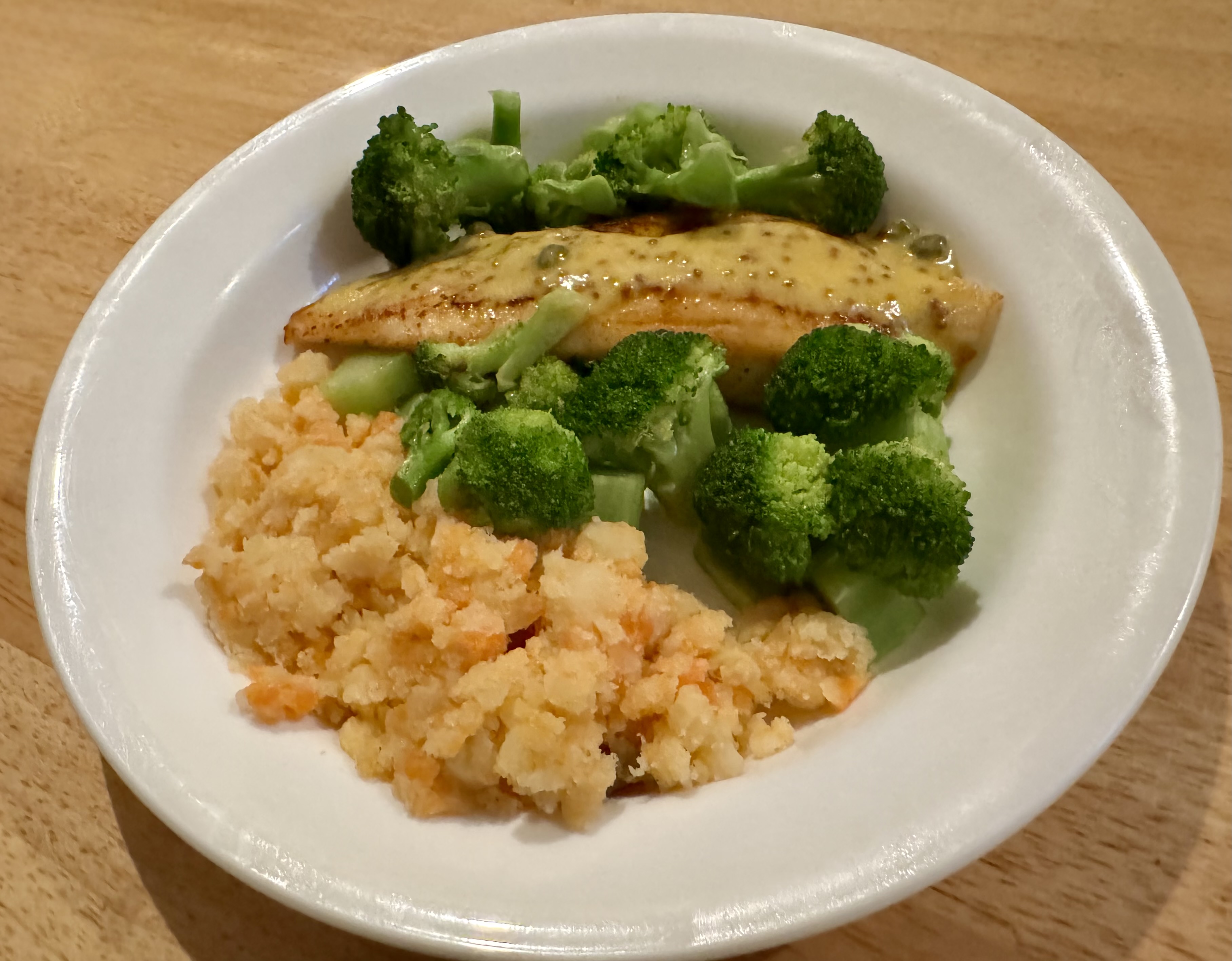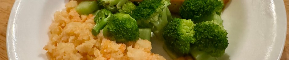 Tilapia seems to be held in low esteem by chefs and fish eaters. I find the fillets that I get frozen from Costco to be a tasty, cost-effective entree for John and me. As usual John cooked the fish and I took care of the vegetables and sauce for the fish. We had some leftovers that I needed to use up – a ramekin of mustard sauce, half of a sweet potato, and a russet potato that had hung out in the fridge too long. I warmed up the mustard sauce and microwaved the potatoes and then mashed them up with a pat of butter for my combo mash. I steamed the broccoli and, voila, we had a fine dinner!