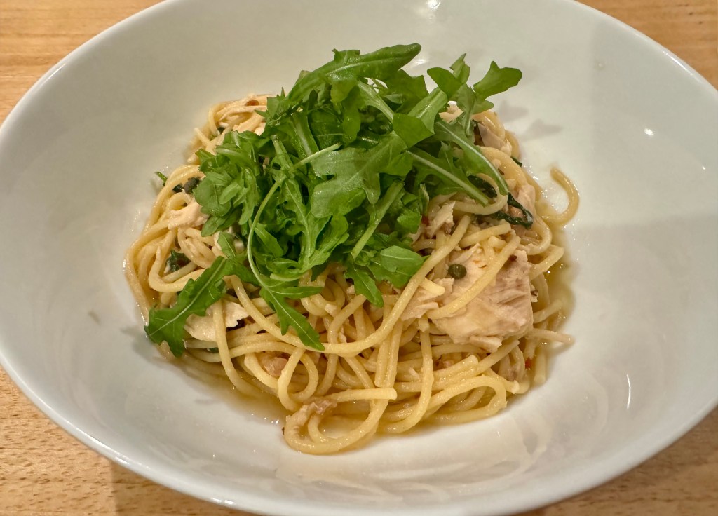 This is an easy but very tasty dinner. And it can all be made in the time it takes to heat up the water and cook the pasta. While John was tending the water and the pasta, I sautéed onions and garlic in olive oil with some salt, chili flakes, and oregano. Then I added the broccoli florets making sure they were cooked but still retained their bright green color. After John drained the pasta he added it to the broccoli mixture and I stirred it around over a low flame adding a little reserved pasta water and a little more olive oil. Right before serving I added the canned tuna trying to leave it in large flakes while folding it into the pasta and warming it through. This is a quick and easy but satisfying dinner.