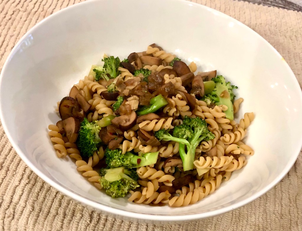 I also has some new potatoes that I boiled but, in a Chopped-like moment, I neglected to get them on the plate and no one noticed. John and I ate them afterward for a potato dessert. ( For readers from other countries, Chopped is an American TV program where contestant chefs try to make a dish out of four disparate ingredients. Forgetting to get an ingredient on the plate is a common, usually eliminating, mistake.)
