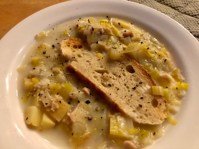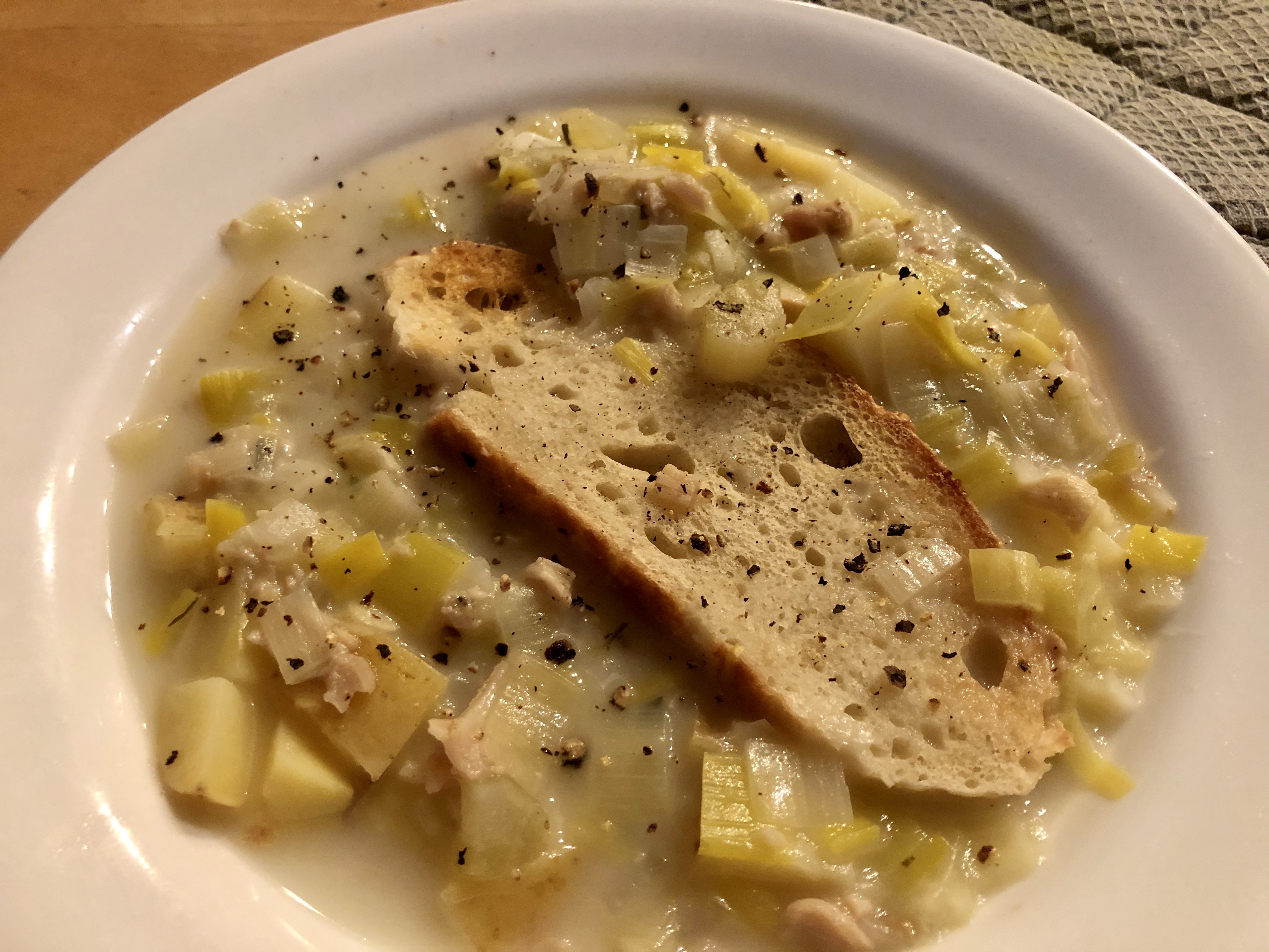 I am also going for ease of preparation here. I use jarred bottles of clam juice and canned chopped clams. The only sort of time consuming chore is cleaning and cutting up the leeks, everything else is pretty straight-forward.