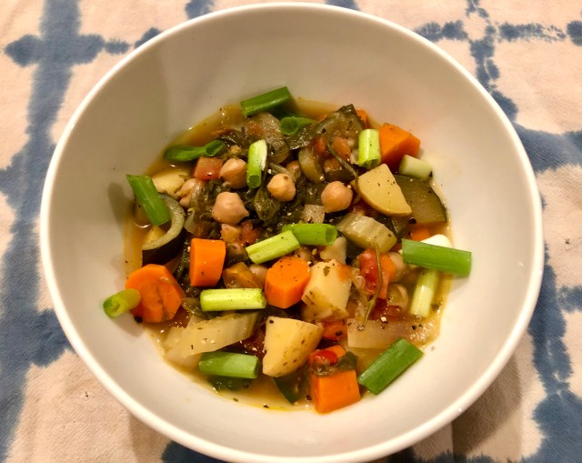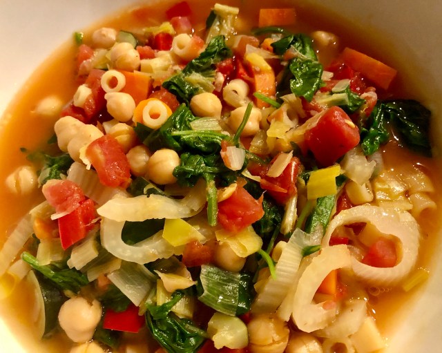 This stew/soup is a lot like the vegan vegetable soup I had for dinner a few days ago. Instead of kale I used a pre-washed combo of spinach and arugula and rather than potatoes the starch in this dish was ditalini pasta. Otherwise they are pretty much the same. I am including the recipe for this chickpea rendition but please feel free to substitute different beans, starch, and greens plus use what vegetables you have. I had a leek and a part of a fennel bulb so I used them this time instead of an onion and celery. You will still get a good result and each time it will taste a little differently.