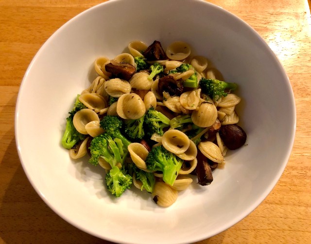 While the water was heating up I cooked the mushrooms until they were browned and then added some garlic and onion to the sauté. When the onions had softened I turned the flame to low and waited until the pasta had about 4 minutes to go. At that point I added the broccoli and cooked them with a little pasta water. John dumped the orecchiette into the mushroom mixture and I stirred all together along with some additional reservation pasta water for a moment or two. At that point we filled our bowls and sat down to enjoy a delicious dinner.