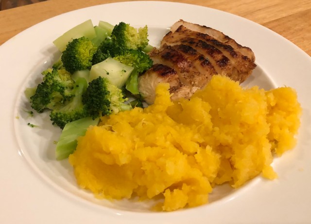 My BDF consisted of two eggs scrambled, a veggie breakfast patty, and toast. John made himself an omelet which I never saw since a lot of times he will eat a quick dinner like this standing up in the kitchen.