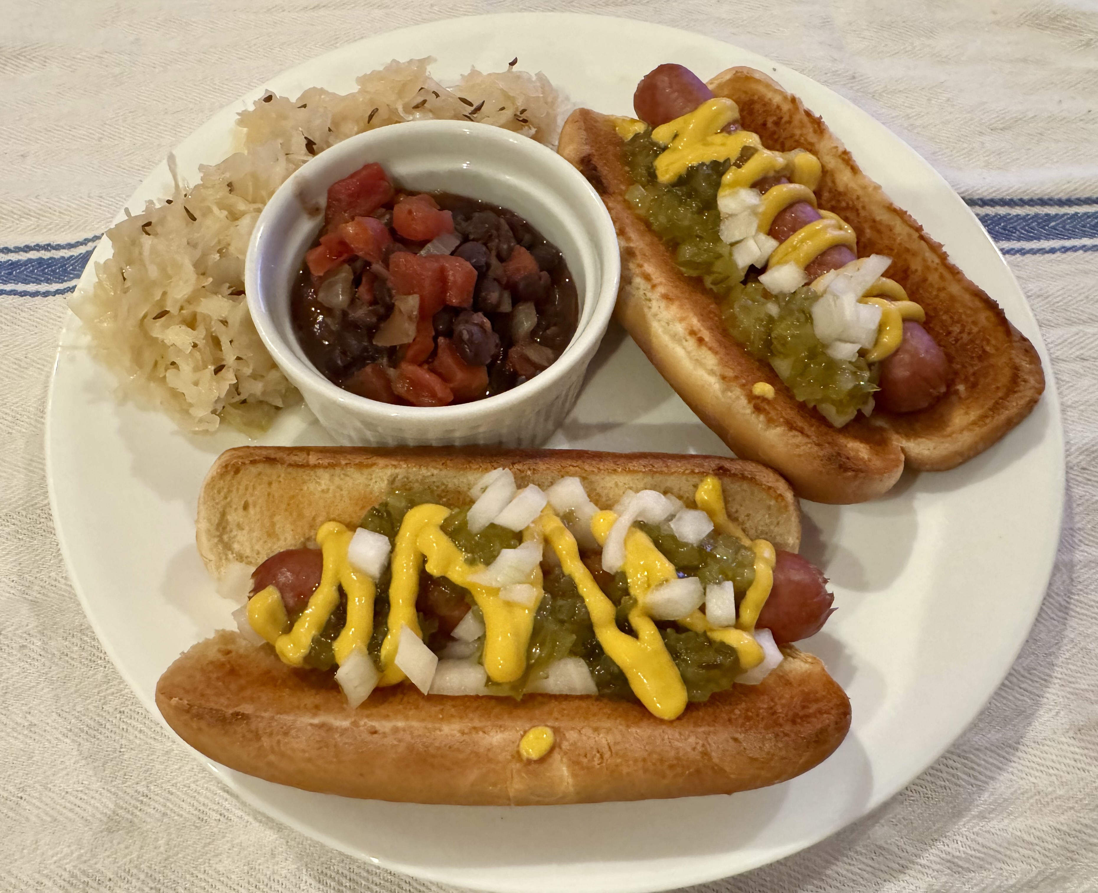 I boiled the hot dogs and warmed up the beans on the stove with a can of Rotel, cumin, and too much chipotle powder. I fancied up the canned sauerkraut with some sauteed onions and garlic, caraway seeds, and a dash of sugar. John toasted the buns in the oven. It was a summertime kind of meal which fits in with the weird weather we have been experiencing. The temperature’s high yesterday was 83. What is going on? We are in the second week of November!
