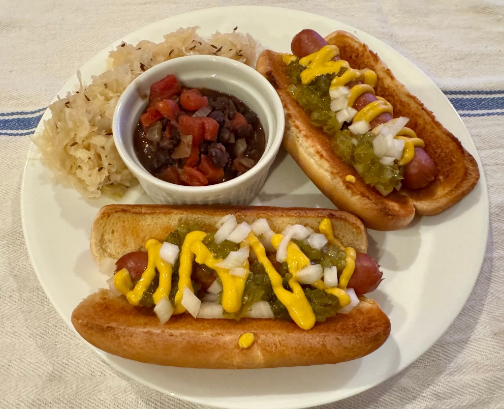 Other than these Nathan’s hot dogs being too skinny and my over-seasoning the beans with chipotle powder, this was an all-American dinner. The hot dogs were advertised as spicy which they were not. They were also “bun length” which made the tubes of all-beef meat skinnier. Between the bun and the condiments it was hard to find the dog! However they were on sale for $2.50 so I guess I was willing to overlook their skinny selves when I bought them.