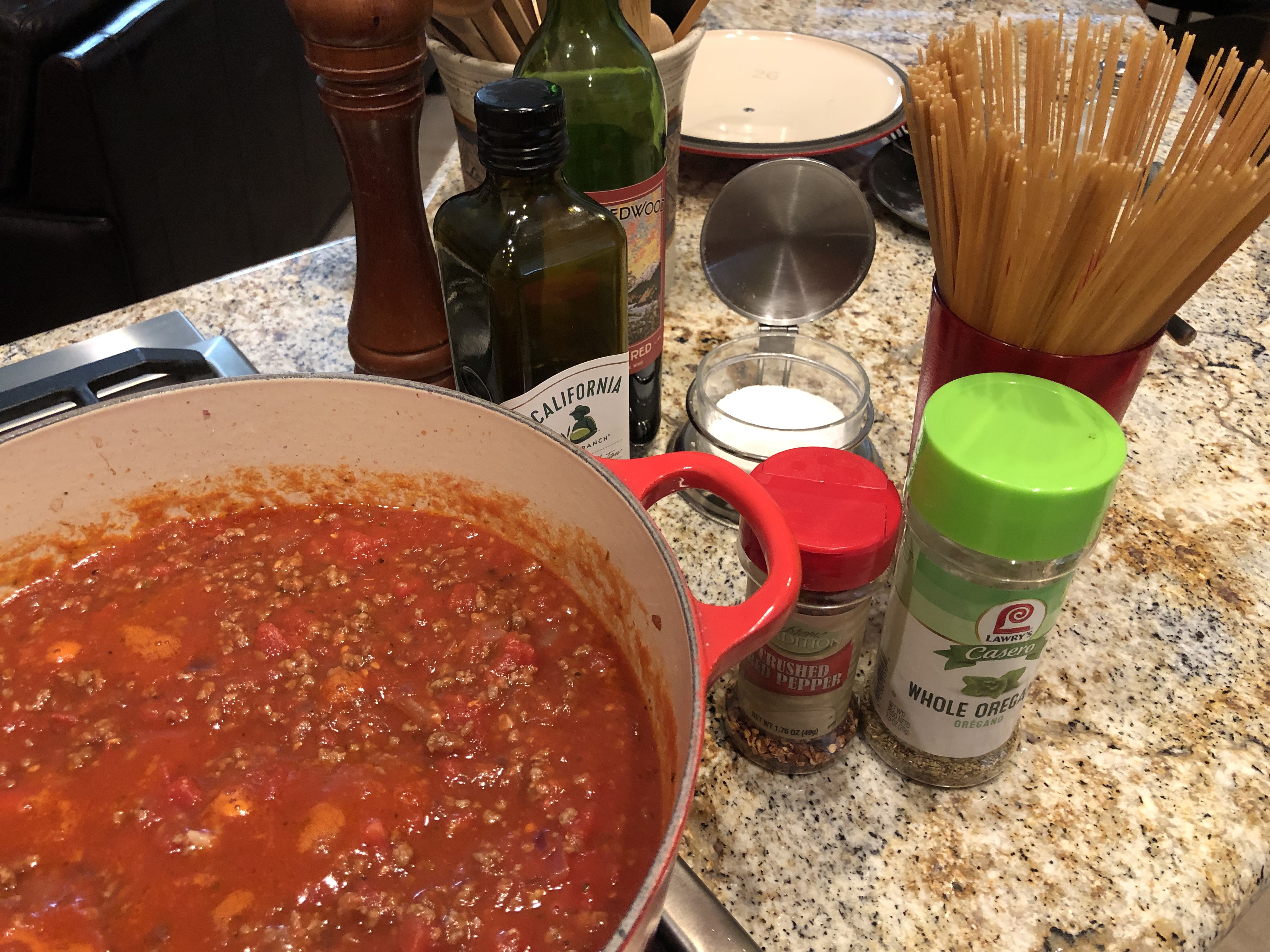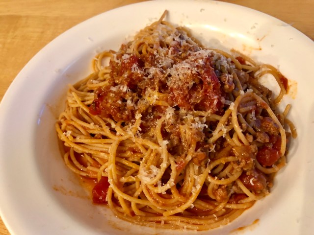 Starting my pasta sauce is seasoned ground beef browned in olive oil. After taking the beef out of the pan I saute the onions, dried oregano, garlic, chile flakes, and tomato paste and deglaze the pan with red wine. Then I add the ground beef back in along with a large can of San Marzano tomatoes, a regular sized can of tomato sauce and and one of petite chopped tomatoes and some fresh tomatoes that I have peeled. It all cooks for an hour or so and then it is ready to top our whole grain spaghetti.