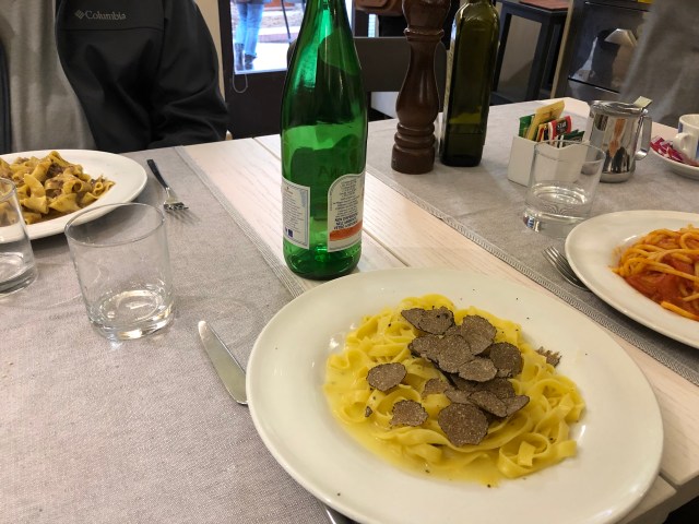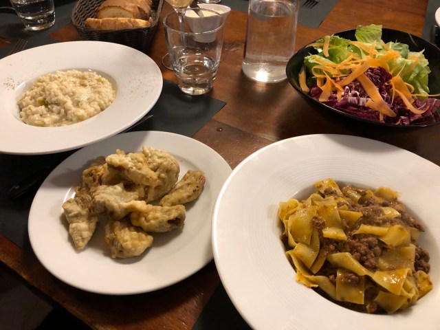 When the ditalini is done add a package of greens. Tonight I used Fresh Express mixed spinach and arugula but sometimes I add all spinach or baby kale. When the greens have melted into the stew give it a taste and add more salt if needed. You are ready to serve it up!