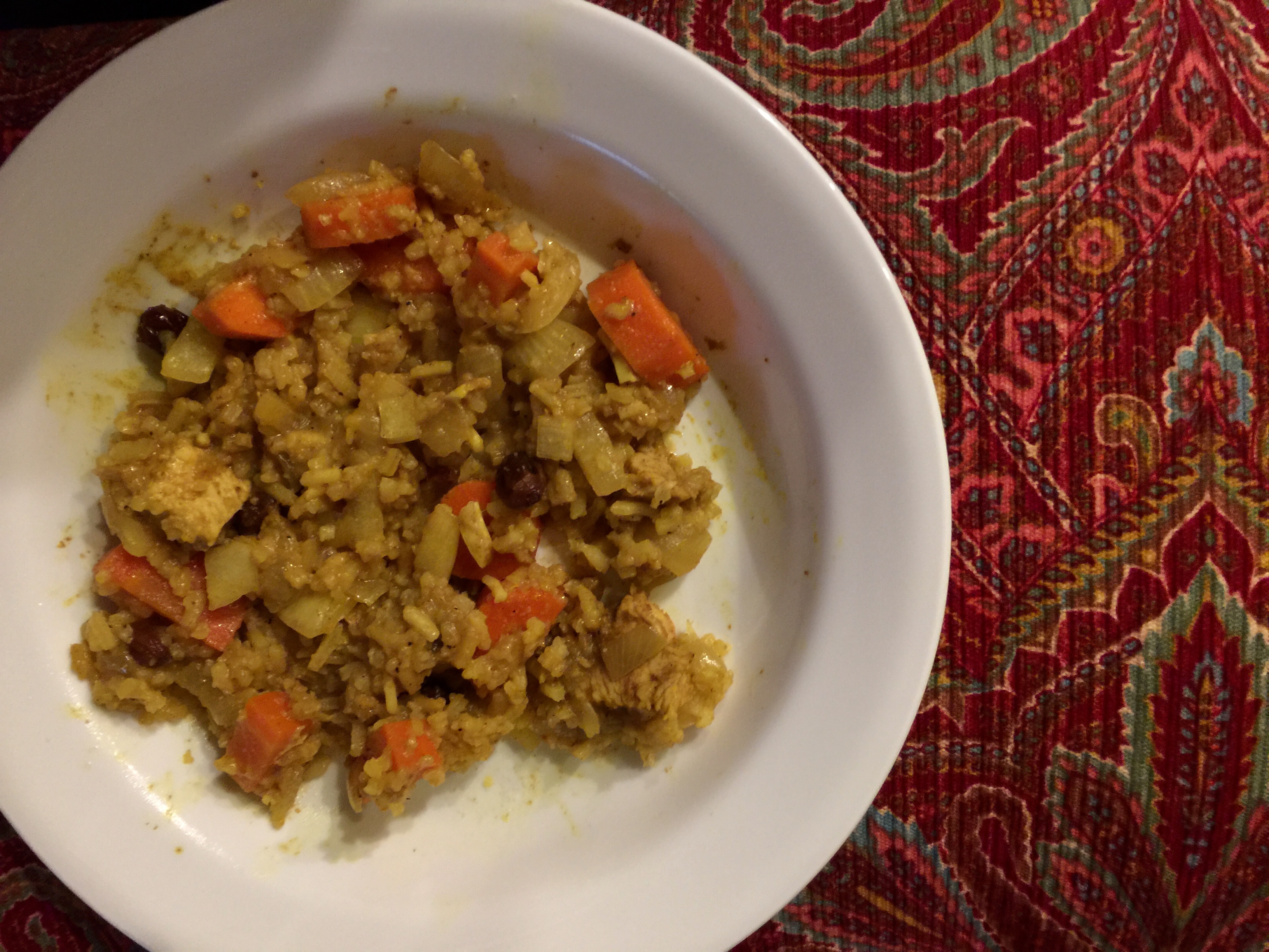My contribution is chopping the onions and carrots. I have hurt my back so am spending limited time standing up. So many hugs to John for taking the lead role in dinner tonight. It is a combination of chicken, rice, onions, garlic, raisins, and carrots cooked all together with a curry spice blend – an easy and enjoyable one pot meal.