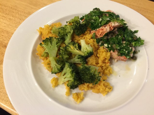 For some reason we have less success cooking fish than anything other protein. Shellfish, we are usually cool with but fish, especially salmon, we have a hard time getting to look like the photos from cooking sites. Tonight’s salmon is slightly over cooked and oozing out so much of that white stuff that we mostly hide it under the parsley/caper/scallion sauce.