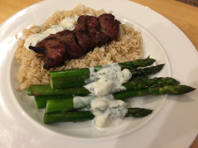 In keeping with my pledge to make some new recipes, here is one that we tried last night. It is a good idea but we need to work on it some more. We used the immersion circulator to cook the meat to to 130F and then put it on the grill to get some browning. Unfortunately it came out kind of medium well instead of medium rare. We are thinking of just cooking it on the grill without the pre-cook and threading a little bacon between the lamb to keep it moister. The tzatziki I made came out well and is just a mixture of plain yogurt, lemon, cucumber, garlic, and mint. We served our lamb kabob over brown rice with a side of asparagus.