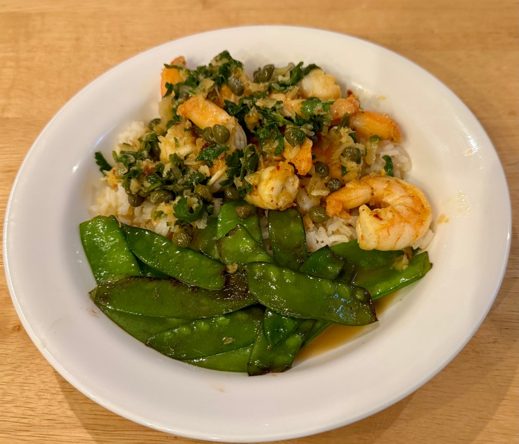 We chose rice as the starch to soak up the garlicky sauce of shrimp scampi. Pasta would work well too. I am including the recipe. Be careful with the lemon juice, tasting and adding a little at a time. You don’t want it to take over the dish.