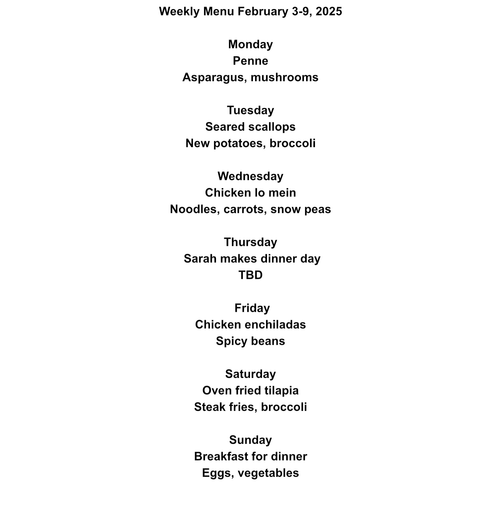 Chicken enchilada with spicy beans and tomatoes 2/7Buffalo chicken wings and pot stickers 2/8Tilapia , broccoli, and new potatoes with pesto