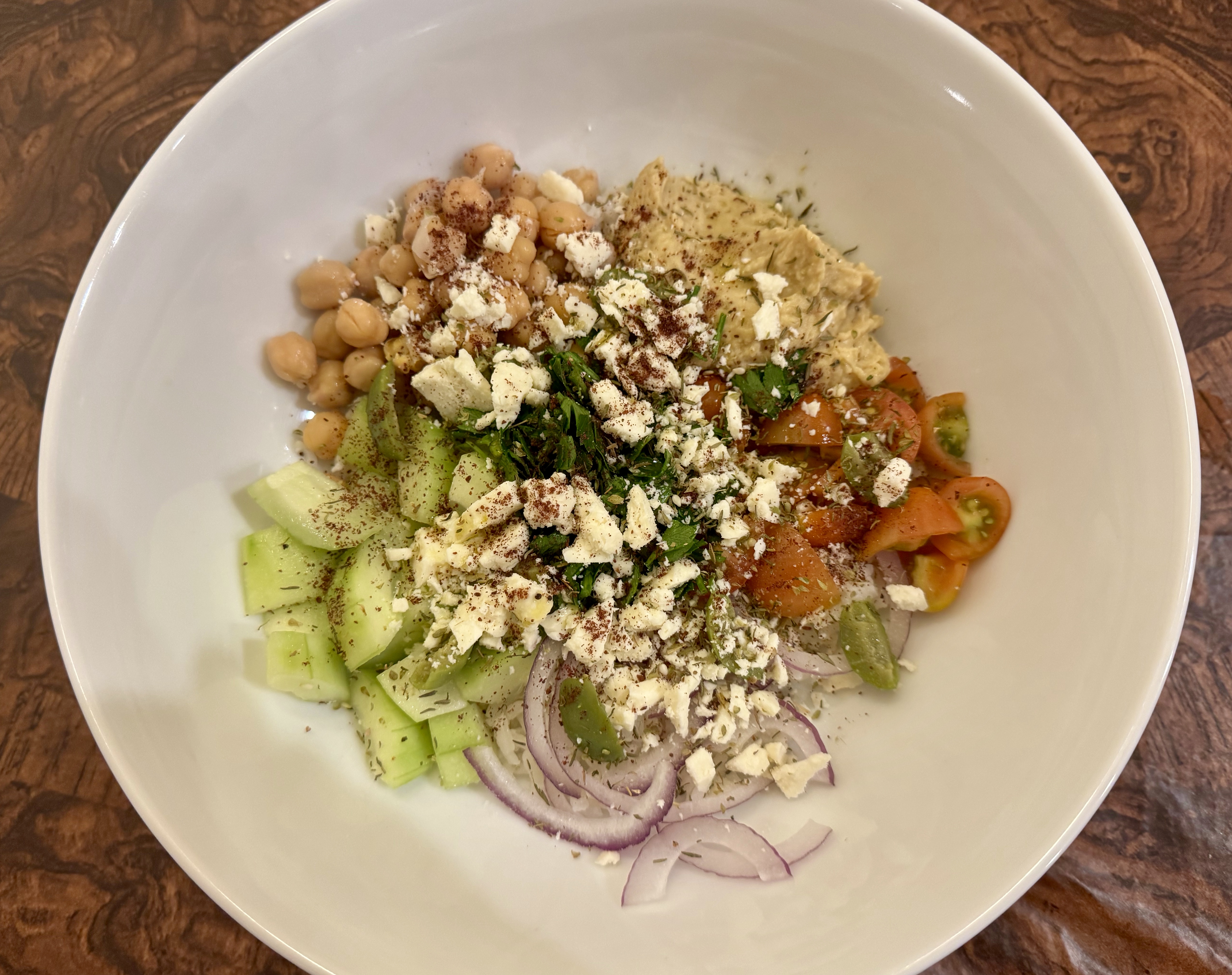 Tonight Sarah made us a Mediterranean bowl. Loaded on top of rice were chickpeas, slivered red onions, hummus, tomatoes, cucumber, parsley, olives, and feta cheese. We gave it a drizzle of olive oil and it was ready to eat. It was tasty, healthy, and filling. I am really enjoying Sarah’s Thursday night creations.