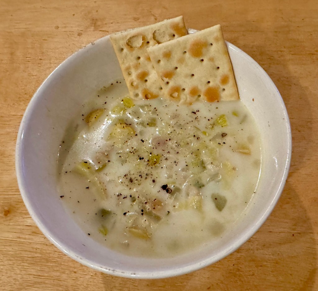 Except for chopping up potatoes, onions, leeks, and celery everything else is pretty much a pantry item. We used canned minced clams, clam juice, the liquid from the clams, and some heavy cream. We made a big pot of it in the hopes that there would be plenty left over. Only problem is that we all liked it so much that each of us had two bowls! There was only enough left for John’s lunch on Saturday.
