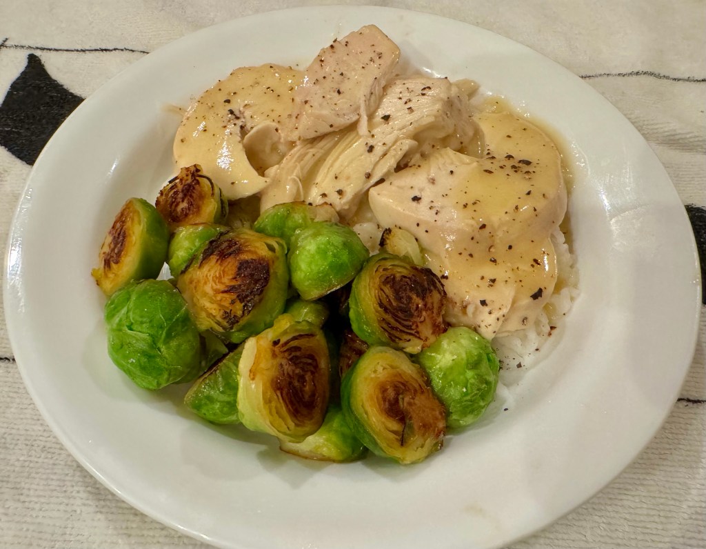 As usual I sliced up one of the chicken breasts and warmed it gently in a pot of chicken gravy made from a packet. The rice was left over from an earlier dinner. I had 20 Brussels sprouts which turned into 40 when I sliced them in half. I start them cut side down in a large frying pan with a little water, a tablespoon of butter, and a sprinkling of sugar. After the water comes to a boil I turn it to simmer and cover the pan and let them cook for about 5ish minutes. Then I take off the cover and let the water steam off. When the water is almost gone I add a shot glass of dry sherry. The sherry cooks off leaving a nice nutty flavor. Then I just wait until the sprouts are browned in the remaining butter in the pan. They are really good. Trust me.
