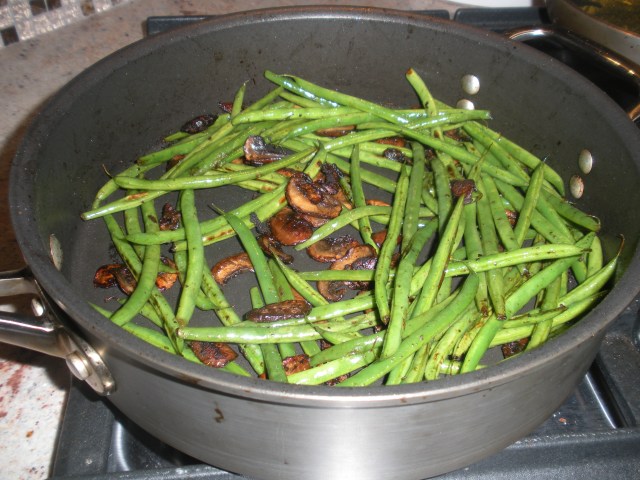 Our green vegetable was small green beans that I get in a large bag at Costco. They are so good but there are a lot of them so we will be eating green beans with every meal for a few days. First I sauteed a bunch of mushrooms and put them to one side. The beans cooked in a small amount of water. When that had evaporated off, I added the mushrooms and a little faux butter and let the beans brown.