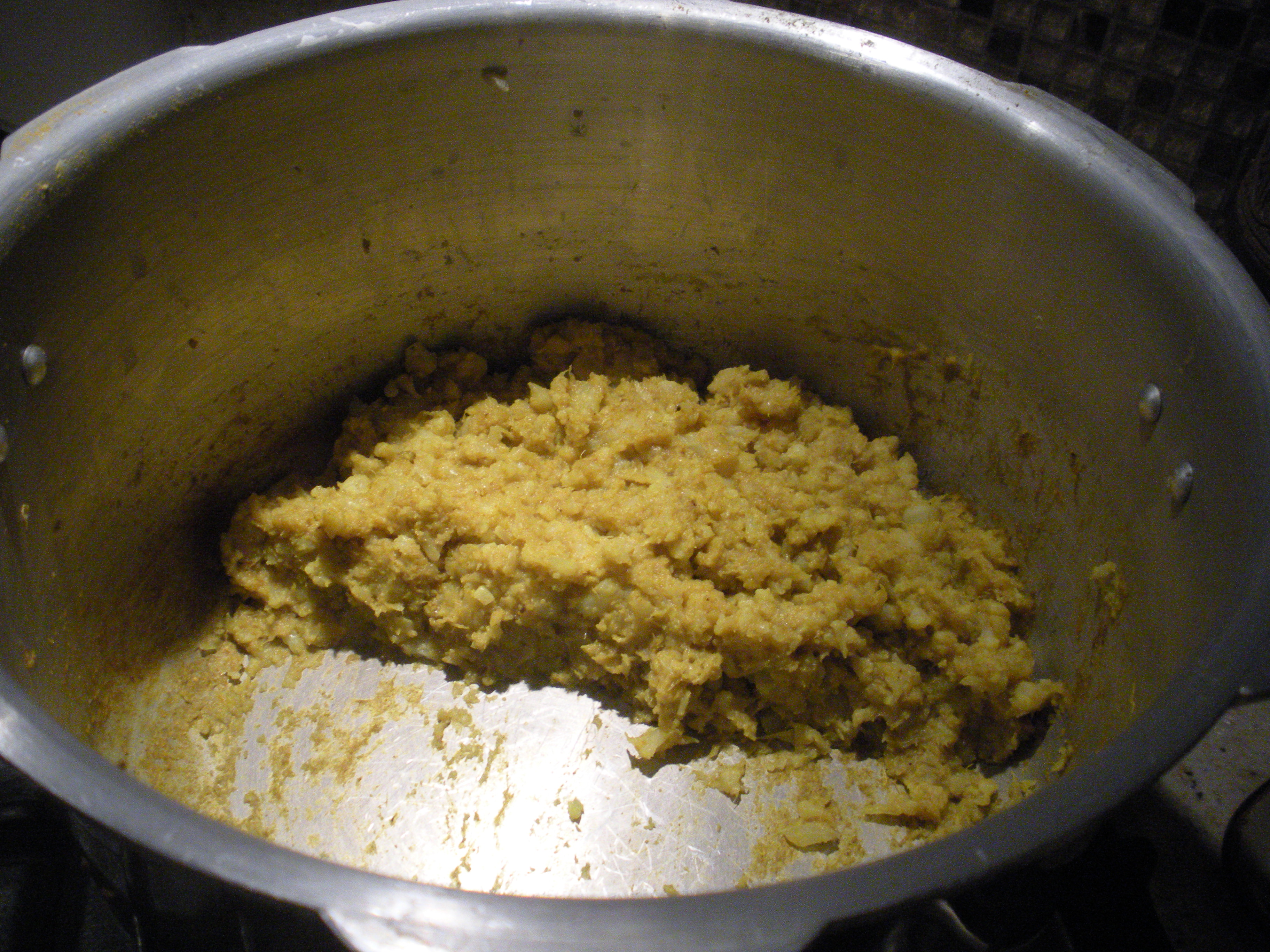I chunked up a whole head of cauliflower and put it in the pressure cooker. After pressure was achieved, I cooked the cauliflower for about three minutes and then cooled the cooker down immediately to release the pressure. I toasted some curry spices in a frying pan. I combined the drained cauliflower, curry spices and a little faux butter in the pressure cooker pot and mashed it up over heat to insure that it wouldn’t be watery.