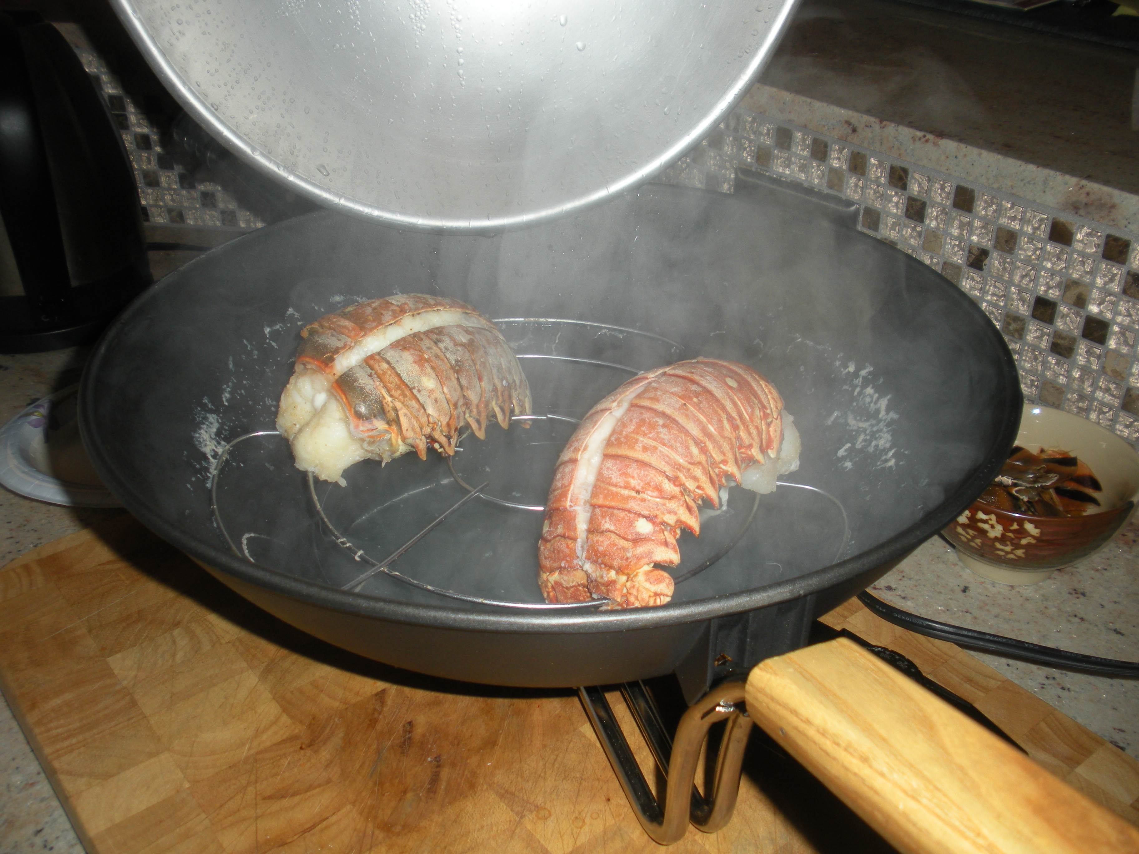 Here’s how we divided up the work and utilized our kitchen space to the best advantage. John steamed the lobster tails in our electric wok. We have one of these woks here in Utah and one of them back home. When stovetop space is at a premium, an electric wok comes in handy. It gets ripping hot and so can be used for stirfrys, steaming, or anything else you would normally do on the cooktop.